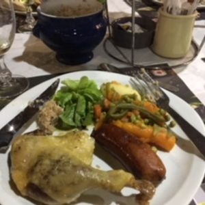 変わった形のパン、中が空洞で、パテのようなものを好きなだけ詰めていただくことに。サラダも十分な種類と量で、満足。メインはチキンのロースト、味もしっかりしていて、美味しくいただきました。