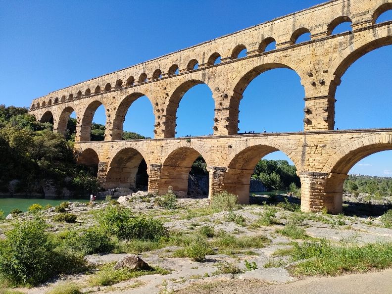 フランス旅行を計画した際、どうしても行きたいと思っていたポン・デュ・ガールを訪れることができました。西暦50年ごろ建設されたという水道橋は存在感抜群で、見る者を引き付けて止まない個性を放つ歴史的建造物でした。