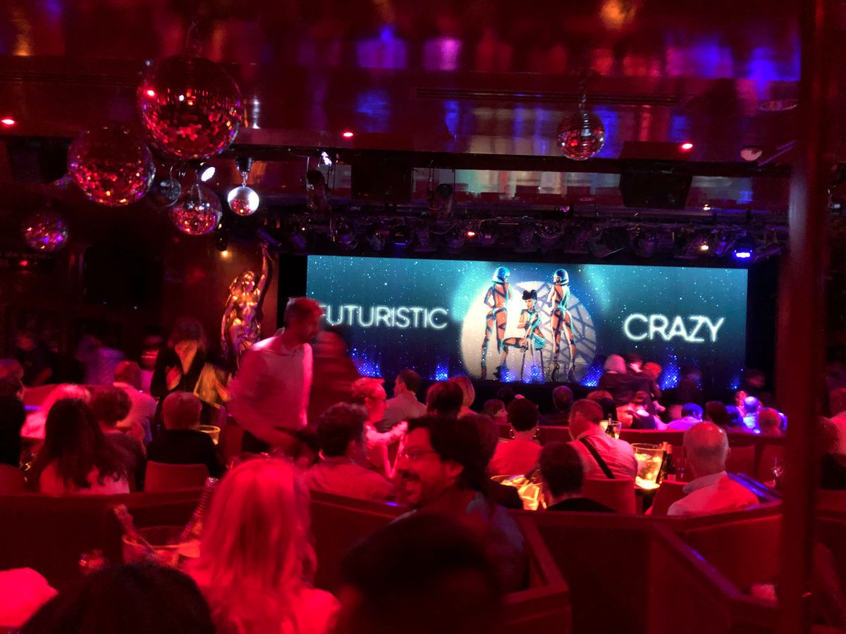 席は後方だったが、リドやムーランルージュより規模が小さいため、十分鑑賞できた。光と音楽の中で、スタイル抜群のダンサー達のシンクロナイズされた動きが秀逸だった。また、中間の色物として、二人の男性によるジャグリング(二人でジャグリングをする隙に、一人がズボン、上着、ネクタイ、シャツを脱いで相手に渡し、その後は逆に、渡したシャツ、ネクタイ、ズボン、上着を着る、という技)は、スリルがあって面白かった。