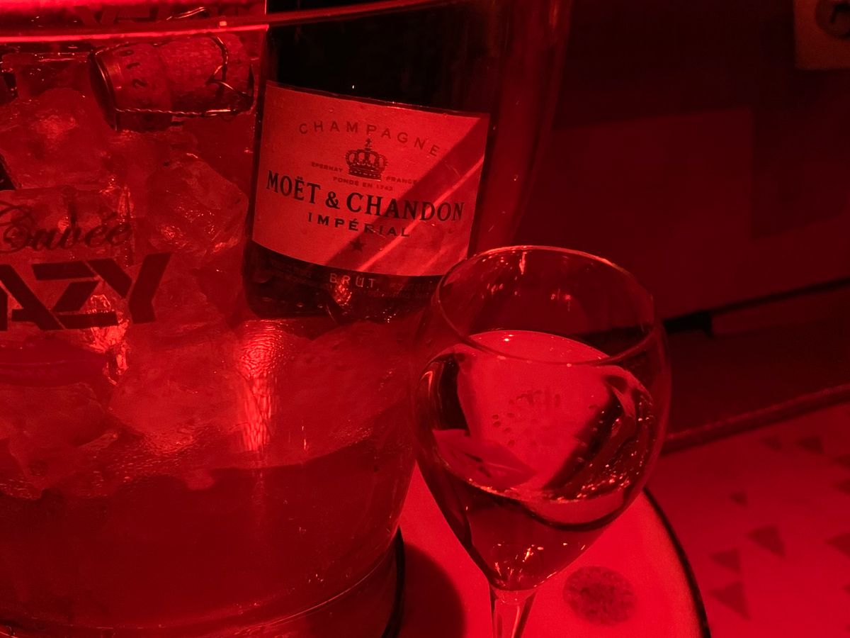 テーブル席は海外の女性親子二人組と相席で、ボンソワールと挨拶を交わして着座。すぐにシャンパンが運ばれてきました。