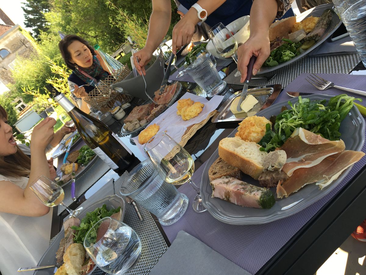 壮大なブドウ畑の素敵なお庭を傍らに、手作りパン、テリーヌ、ジャンボン、マーシュなどなどお料理上手なオーナーが作ってくださるご飯と数々のシャルドネのオンパレード。こんなにもワインて美味しかったかしらなんて思いながらいただくランチは何物にもかえがたい、説明の仕様がないほど素晴らしいものです。これは行った人しかわからないです。プールつきの広ーいお庭の中でみんなでワイワイお話しながらいただくお食事は格別でした。ご一緒したメンバーもよかったのかなヾ(*´▽`*)ノでもきっとどなたが行かれても素晴らしいものになるかと思います。お天気がよいと尚よしです。ワインの種類、歴史などをあらかじめバスで聞いてからのお食事だとまた奥深いものがありますよ。