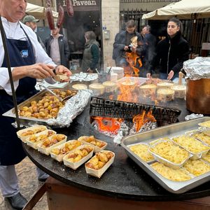 また、最後のテーブルでは、買った来てチーズ フォアグラ パンなどの食材の他にそこの名物料理を出してもらい、数種のワインと一緒に食べ お腹いっぱいになる。