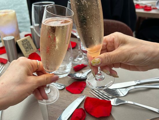 クルーズ船に参加したく、せっかくなのでディナー付きの窓際を予約しました。シャンパンフラッシュのときには、デッキに移動していたので窓際じゃなくても良かったのかなと思います。