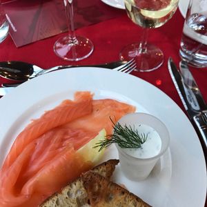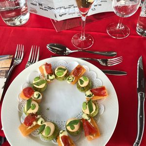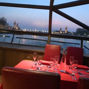 18時45分のクルーズに参加しました。オルセー美術館の前の川岸で受付していただき船内へ。指定されたテーブルは船のちょうど中央、真ん中に給仕カウンターような所の隣に案内されました。正直、片側しか見えないかもと思いました。出航時間になってもテーブルは半分ぐらいのお客さんです。テーブルチェンジもと思いましたが、クルーズ船は行って反転するので、片側でもいいか?と思いそのまま出航となりました。最初、上流・東向きに動きだし、すぐシテ島のノートルダム大聖堂の前を夕暮れ時に通り過ぎました。食事も進み、船が反転し、夕闇に包まれた頃、エッフェル塔の前を、その時ラッキーにもシャンパンフラッシュです。とても優雅な気持ちになれました。テーブルチェンジせずとも、2つのランドマークを一番良いタイミングに目の前で堪能でき、結果OKでした。お料理は口コミで色々とありますが、ふつ~に美味しいですよ。何より、ゆっくり落ち着いて座れて、景色が流れ、親子でお話ししながら食事できて良かったと思います。お値段コスパとしては、とても良いと思います。また機会あれば乗りたいです。