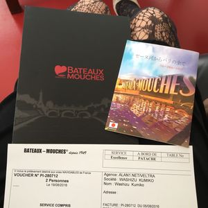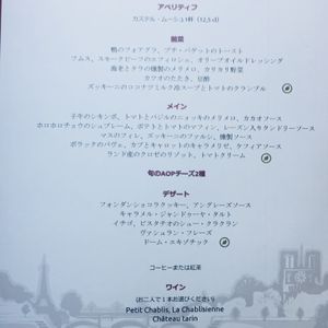 18時スタートで出発1時間前がチェックイン時間でした。30分前に着いて受付をすると18:15発で17:45の乗船時間まで自由だが待機場所(他の船の待合スペース)があると言われ、待機場所で時間を潰しました。どこの国から来たのか聞かれて日本と答えると、頷きながら仏英、中国語表記のメニューを渡してくれました。日本語のはないのかもしれません。水はガス入りとガスなし、ワインは赤か白を選べます。お料理はボリュームもあっておいしかったです。お手洗いもキレイでした。ただ、バースデーオプションを付けていたのですが、オプションのケーキがないまま終わってしまいそうだったのでそのことを伝えると、この時間のクルーズは短いのでできない、次の時間帯ならしている、と言う返事でした。このことがわかっていたら、絶対にオプションは付けてませんでした。オプション料金は払っているのに、何もないなんてありえません。。。