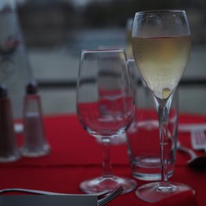 乗船後は窓側テーブルに案内され、グラスのスパークリングワインで乾杯。