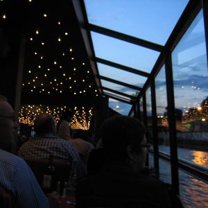 6時20分頃に出港し、結構なスピードでのクルーズで7時半前には港に寄港。到着してからデザートとコーヒーがテーブルに来たと思ったら、もう下船してくれといった勢いの片づけ方。次の時間帯のクルーズの準備で忙しいのはわかるのですが、フォークをおいたとたんにはっきりと「次があるから降りてくれ」と言われました。友人を誘って期待して乗っただけに、あまりにもあわただしくて残念なディナーになりました。いつもこうではないと思いたいのですが、この時間帯は景色だけを楽しむつもりで乗った方がいいかなと感じました。