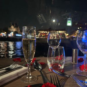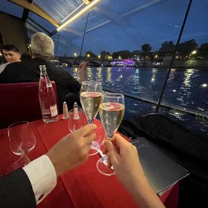 窓側の席を予約しまして食事をしながらセーヌ川をクルーズし、セーヌ川沿いの街並みの夜景を楽しめました。特にちょうど22時くらいにエッフェル塔のすぐそばを通るように計画されているようで、デッキの上から間近で見るシャンパンフラッシュは本当に一生の思い出になりました。