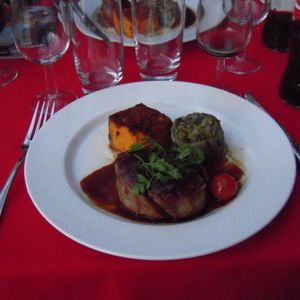 集合時間より早くついて、船がぎりぎりまで来なくて寒くて少し不安になったけど、ガラス張の一番前のテーブルに案内されて、ながめムードは最高でした。前菜のオードブルはとても美味しかったけど、ステーキは6ユーロ追加料金で、硬くていまいちでした。お魚はおいしかったです。8時に終わって、歩いてクリスマスマーケットに行けました。