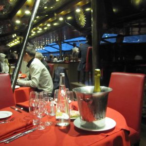 2人の場合は前方とクチコミに書いてありましたが、最前列で最高の眺めでした。お料理は、まあ、こんなもんだろうって感じですが、ディナーはその辺のレストランで食べてもこの位払うようです。それを考えたらクルーズがついている分文句なしです。旅行ツアーで一緒になった人は、某日本人向けディナークルーズに参加しましたが、窓際は相席で155ユーロだと言っていました。料理は同じ位らしいです。何だかすご~~く得した感じ。場所もぜんぜん分りにくくない。みんなのクチコミが大いに役立ちました。エッフェル塔が感動するくらいきれいでした。他の建物は思ったよりライトアップもなくたいしたことはありませんでしたので、今度はランチクルーズも参加したいと思います。私達はRER線を使いましたので、目の前でとっても便利でしたがRER線が不安な人は地下鉄もすぐ近くです。