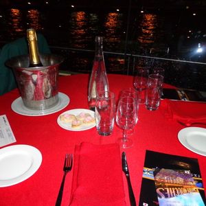 母と2人でパリ旅行。最終日の夜に豪華なディナーを・・・と思い申し込みました。とても楽しみにしていたのですが当日は朝からあいにくの雨。クルーズの時間には何とか止んでくれましたが霧がすごくてエッフェル塔が上半分見えず残念。申し込みは天気予報を見てからだなと実感しました。ディナーはコース料理を選べます。とってもおいしかった!またパリへ旅行した際にはぜひ晴れた日に乗りたいと思います。