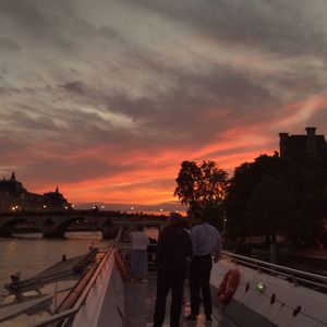 クルージング前まで小雨が降っていましたが、20時30分からの出航頃には雨もやみ、素晴らしい夕焼けを知っていましたが、食事に夢中になっていました。メイン料理が終わり、慌てて外へ。日没後の空は神秘的でした。オリンピック開会式の余韻のあるセーヌ川を観られて良かったです。エッフェル塔のシャンパンフラッシュに合わせてキチンとエッフェル塔へ。素晴らしい景色でした。夏のクルージングは、日が落ちないかと思いましたが、夕焼けからシャンパンフラッシュ。全て素晴らしかったです。