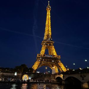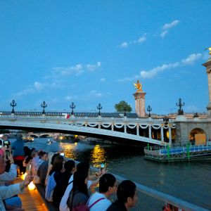 凱旋門は席的に?どこのタイミングかわからず?見れませんでしたが、エッフェル塔は近くで見れ、街並みも楽しむことができました。乗船してすぐに、カメラマンが写真を撮りにきてくれました。その後しばらくすると、写真を売りにきてくれました。1枚なかなかな値段でした。(円安の関係です)だんだんと夕暮れになっていく中のディナーでした。メニューもQRコード形式で日本語表記あり、スタッフさんもわかりやすく説明してくれる方がいました。船内では歌を歌ってくださる方もいらして、非日常を味わえました。シャンパンフラッシュも狙っていたため、船を降りてすぐの場所がエッフェル塔になっており、23:00ぴったりごろに降り場につき、すぐに降りて写真撮影動画撮影もできました。