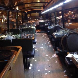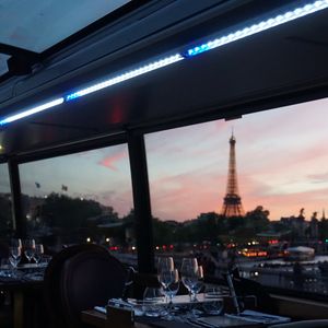 フランス旅行の最後の夜のディナーで利用しました。凱旋門前から出発して、パリの観光名所をバスでのんびり巡りながらディナーを頂きます。バスの1階が調理場、2階が全面ガラス張りのフロアになっており、どの席からでも車窓からの眺めは良いです。エッフェル塔の前では、シャンパンフラッシュの時間に合わせてしばらく停車してくれます。また、テーブルに備え付けのペン型の機器で巡る名所の解説を日本語でも聞けます。後ろを走っている車は迷惑だろうな、と思うほどバスはゆっくりと走りますので揺れはあまり感じません。バスは外観も内装もおしゃれなデザインで、道行く人たちの注目を集めていました。食事の内容は盛り付けも綺麗で味も美味しかったです。スタッフの方もみなさん気さくでサービスもしっかりとしており、フランスでの良い思い出が出来ました。