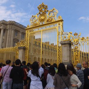 ヴェルサイユ宮殿の当時は剣とカツラを着用の王と王の一族しか通ることが許されなかった金ピカの門の前で写真撮影をしている間にガイドさんがチケットの交換に行かれ、この日はガラガラだったので、全く待つことなく入場できました。