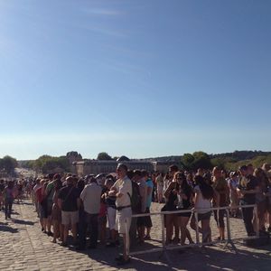 すごい参加人数でしたが、イヤホンガイドだったのでそこまで気にせず観光できました(ヴェルサイユ宮殿自体かなり多い人でした)自由時間が30分くらいあったのですが、お土産の買える所からそのまま外に出ず、出口と書かれた方に行くとなぜか、最初に行った部屋に。逆走が出来なかったので走って出口に向かいました(苦笑)お土産の所を一回外に出て、隣の出口から無事脱出後、合流。横(入り口)を見ると長蛇の列が。個人で行く列だそうで、2.3時間は待つであろうかなり長い列でした。ツアーの方が下手に待たずにそれなりに観れるので良いと思います。ただ、出口の説明はしっかりしてほしかったです。