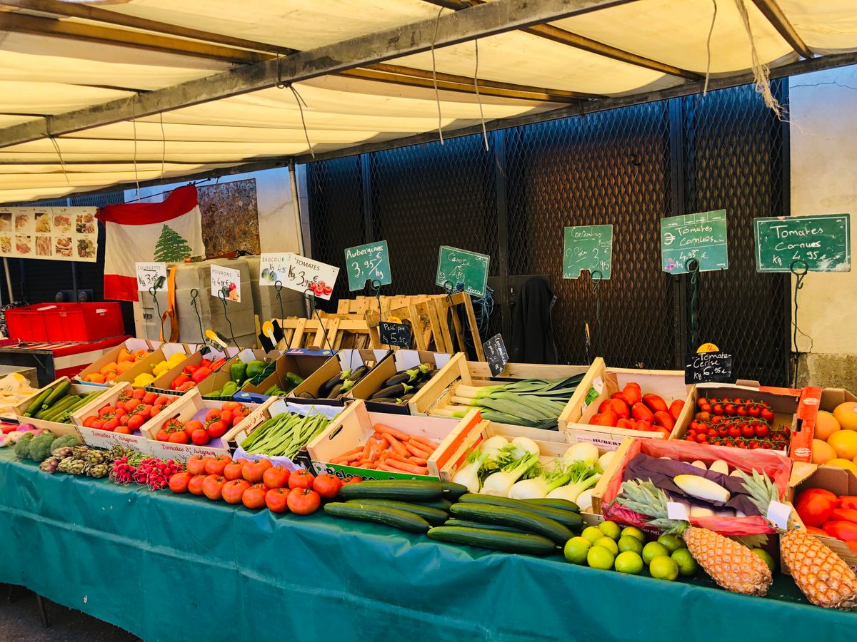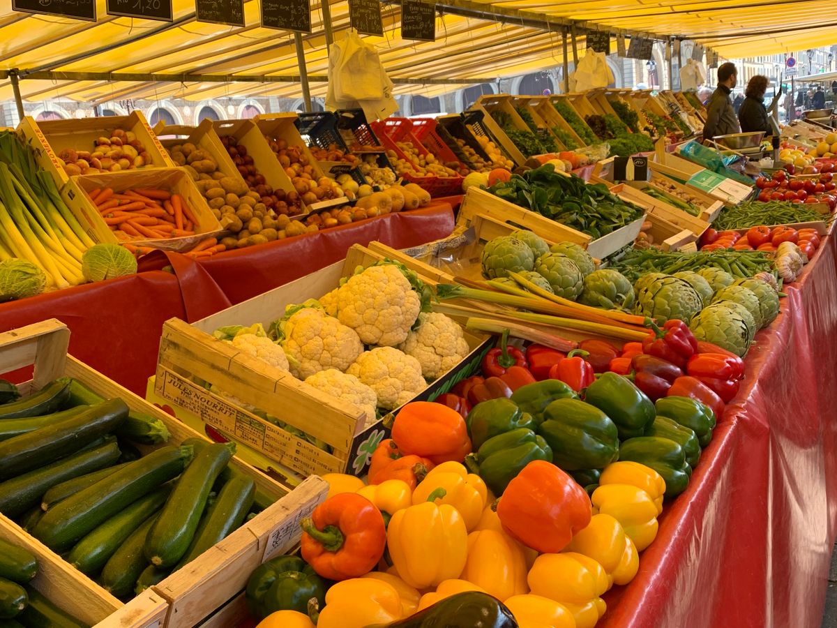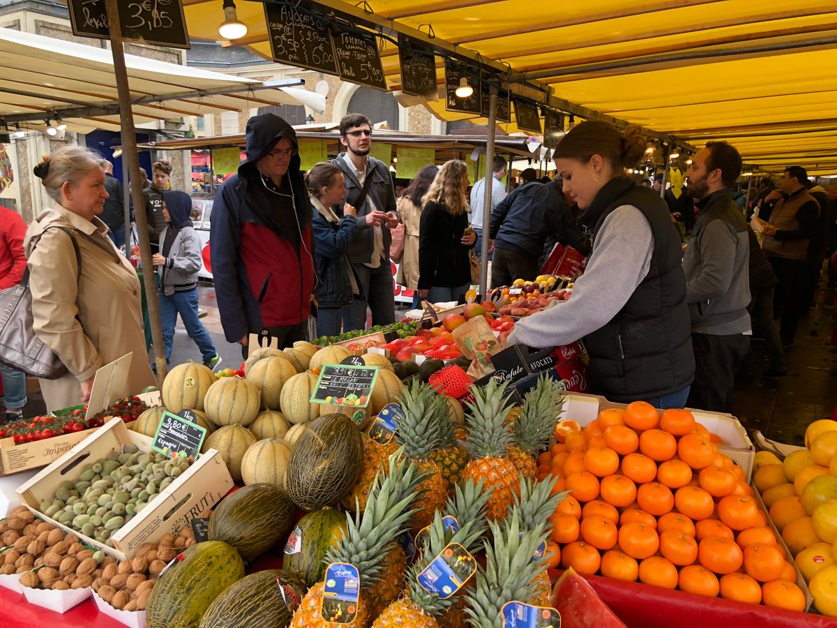 マルシェはチーズや果物を売るお店がたくさんあり、朝市の雰囲気を楽しめました。