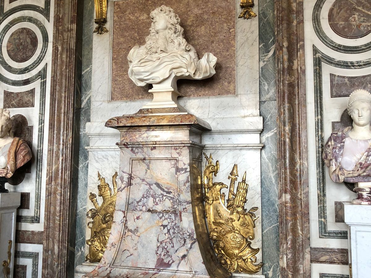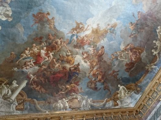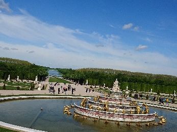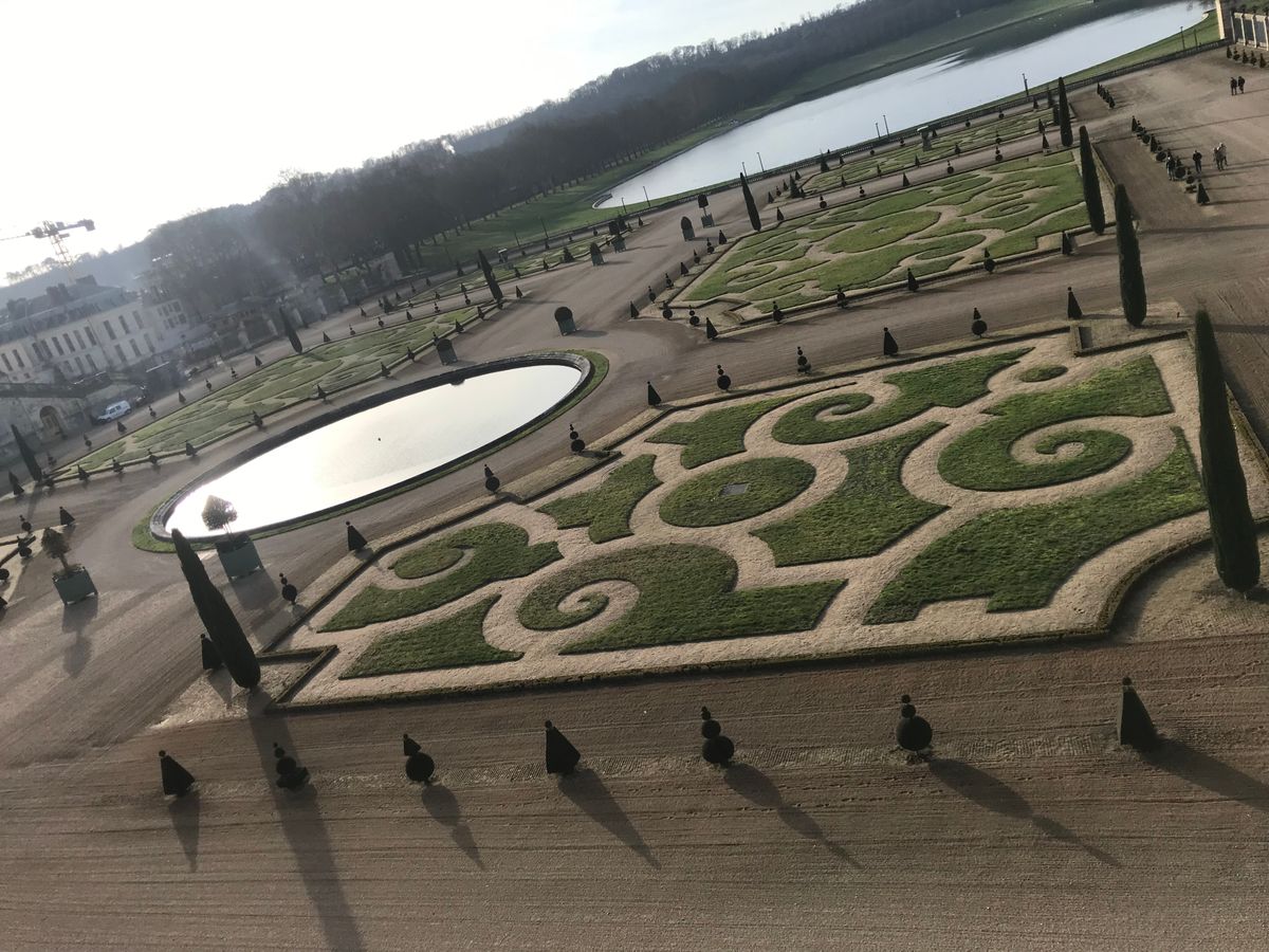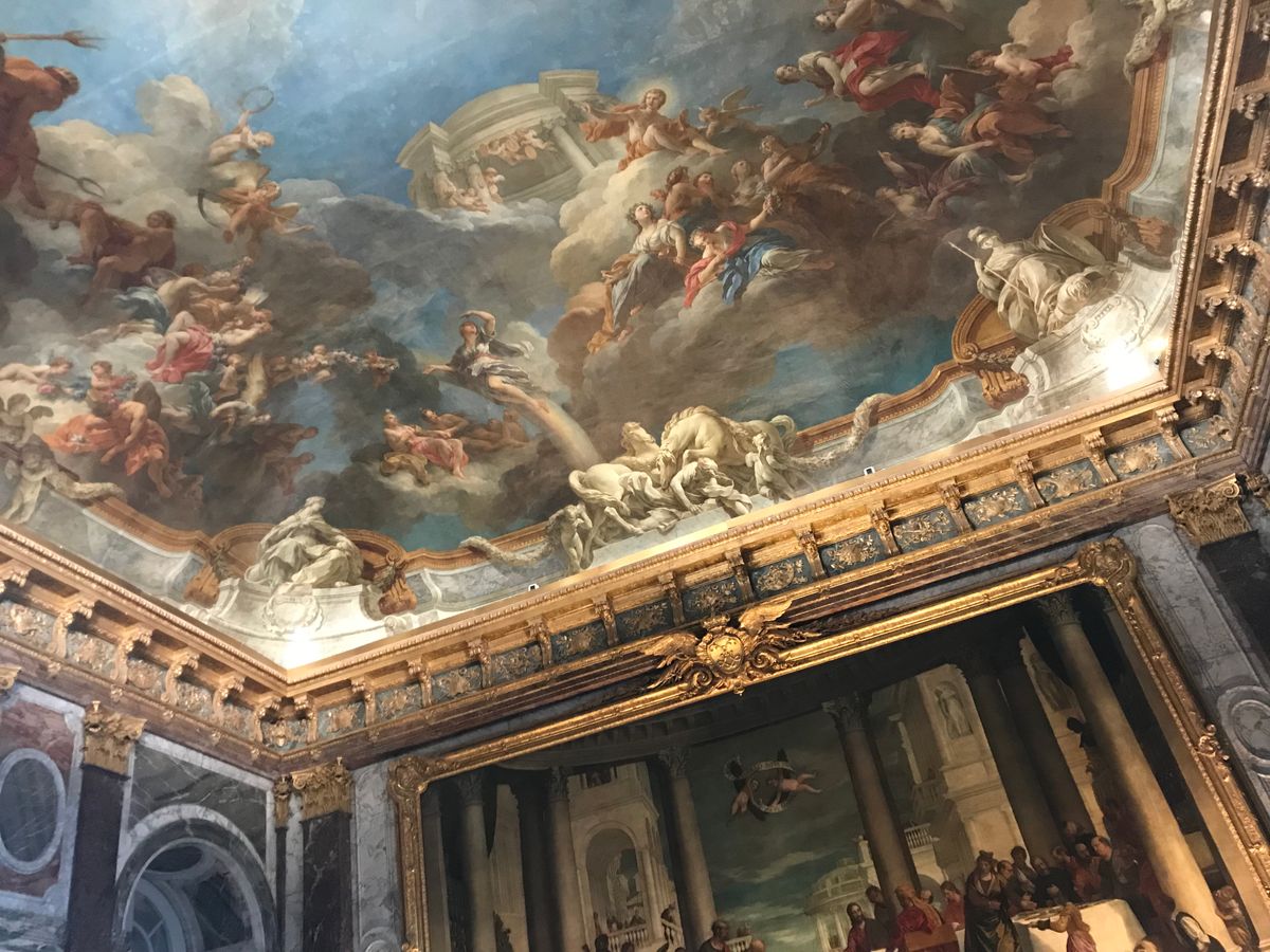 ヴェルサイユ宮殿がどういった経緯で建てられたか、奥様との関係、ルイ14世の9歳のトラウマ、ルイ13世が敵視したニコラフーケの存在、2Fに上がる階段が低いのはドレスを踏まないように設計されている事、ルイ13世は毎朝、決まった時間に王専用の礼拝堂で祈り、10時には朝食と全ての行動を人々に見られながら暮らしていた事などをうかがいながら、飲み物専用の部屋(芸術品のお宝の部屋)、ケーキ専用の部屋(ヴィーナスの間)、ビリヤード専用の部屋(13世がビリヤードが得意)、マルスの間、戦争に勝った部屋、メルキュールの間、アポロンの間へと進みました その間、ルイ13世がファッションリーダーだった話、バレエが好きで自らも上手だった話などさまざまなヴェルサイユ宮殿にまつわる話を聞いてとても面白く、当時の様子を知ることができ、世界史の授業では教わることもない深い生活史を聞きながらの見学にこのツアーに参加して本当に良かったと思いました。その後、見学は解散して、自由時間が1時間程あったので、建物の左側から出て、830㌶もある広大なフランス式庭園を満喫してバスへ戻りました。