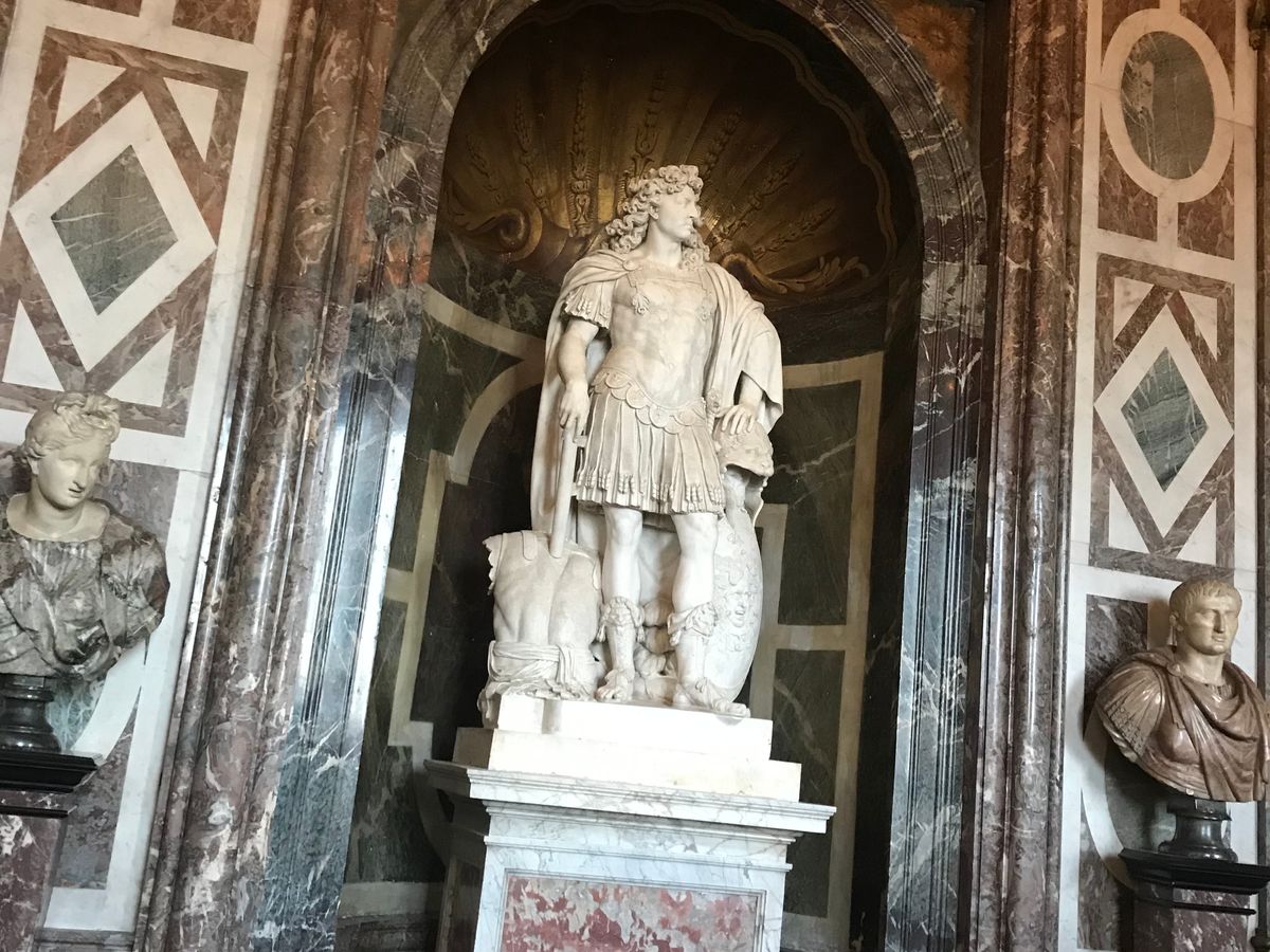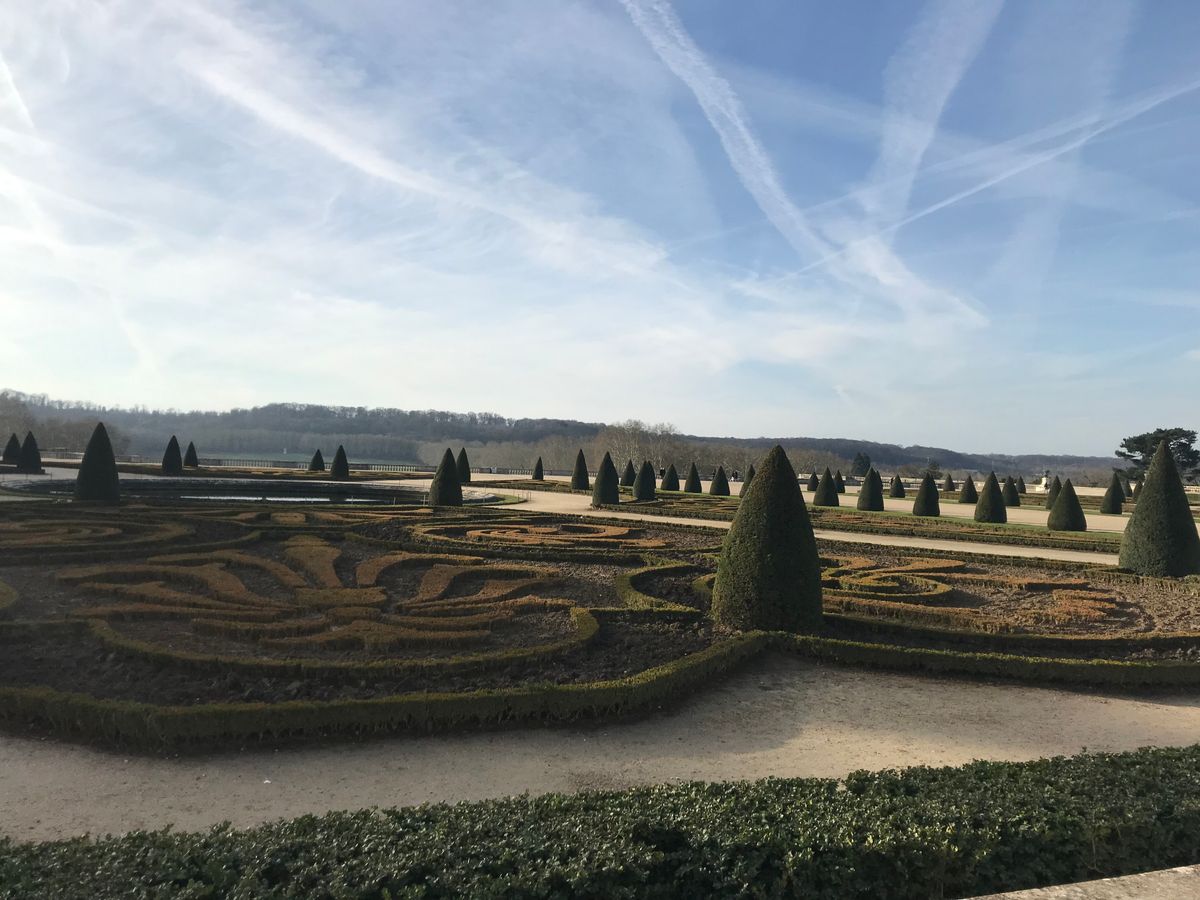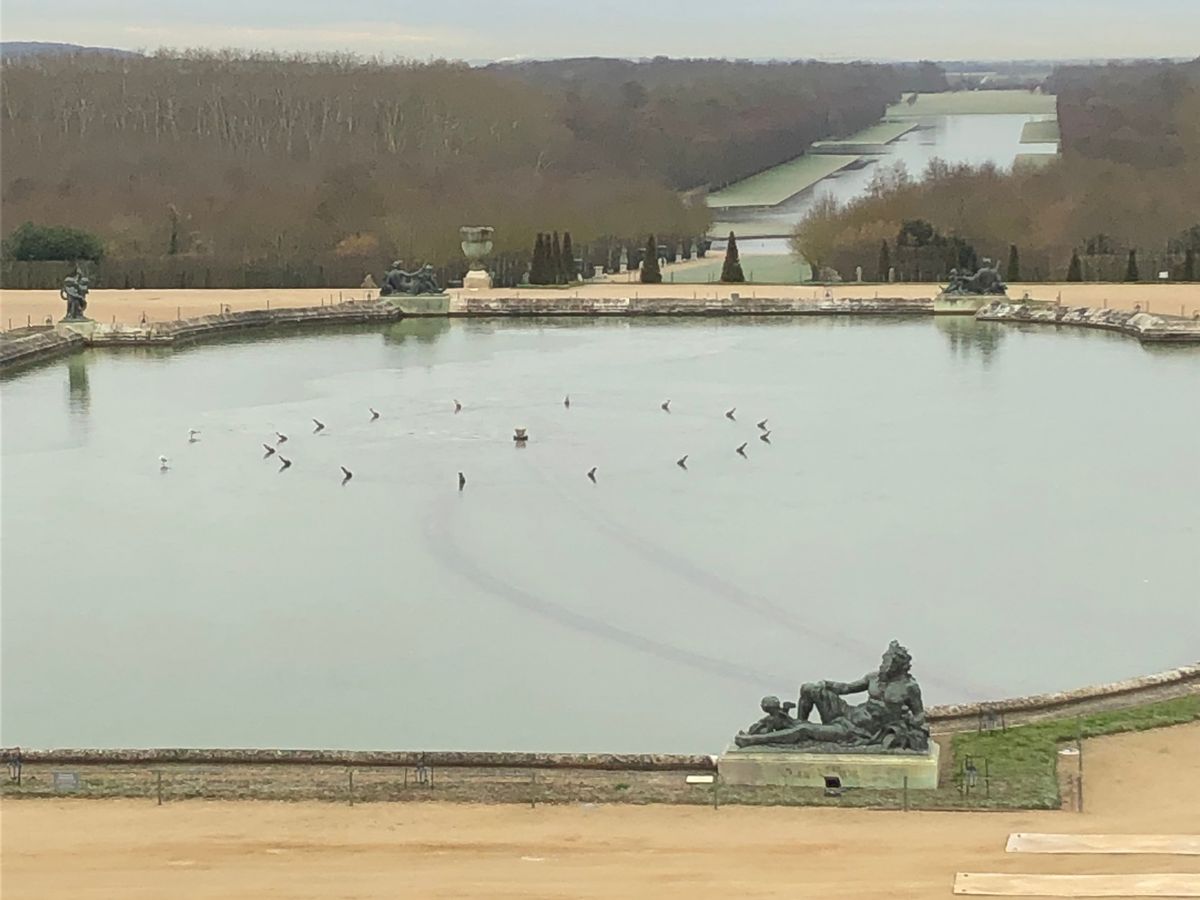 ヴェルサイユ宮殿がどういった経緯で建てられたか、奥様との関係、ルイ14世の9歳のトラウマ、ルイ13世が敵視したニコラフーケの存在、2Fに上がる階段が低いのはドレスを踏まないように設計されている事、ルイ13世は毎朝、決まった時間に王専用の礼拝堂で祈り、10時には朝食と全ての行動を人々に見られながら暮らしていた事などをうかがいながら、飲み物専用の部屋(芸術品のお宝の部屋)、ケーキ専用の部屋(ヴィーナスの間)、ビリヤード専用の部屋(13世がビリヤードが得意)、マルスの間、戦争に勝った部屋、メルキュールの間、アポロンの間へと進みました その間、ルイ13世がファッションリーダーだった話、バレエが好きで自らも上手だった話などさまざまなヴェルサイユ宮殿にまつわる話を聞いてとても面白く、当時の様子を知ることができ、世界史の授業では教わることもない深い生活史を聞きながらの見学にこのツアーに参加して本当に良かったと思いました。その後、見学は解散して、自由時間が1時間程あったので、建物の左側から出て、830㌶もある広大なフランス式庭園を満喫してバスへ戻りました。