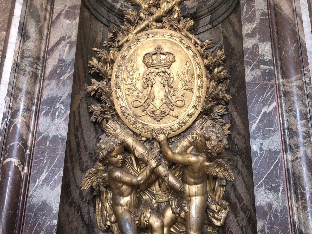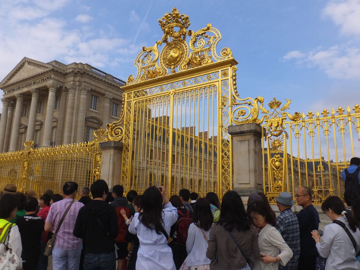ヴェルサイユ宮殿の当時は剣とカツラを着用の王と王の一族しか通ることが許されなかった金ピカの門の前で写真撮影をしている間にガイドさんがチケットの交換に行かれ、この日はガラガラだったので、全く待つことなく入場できました。