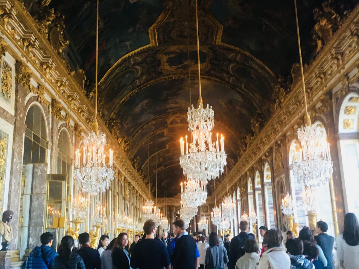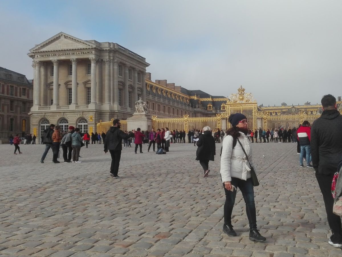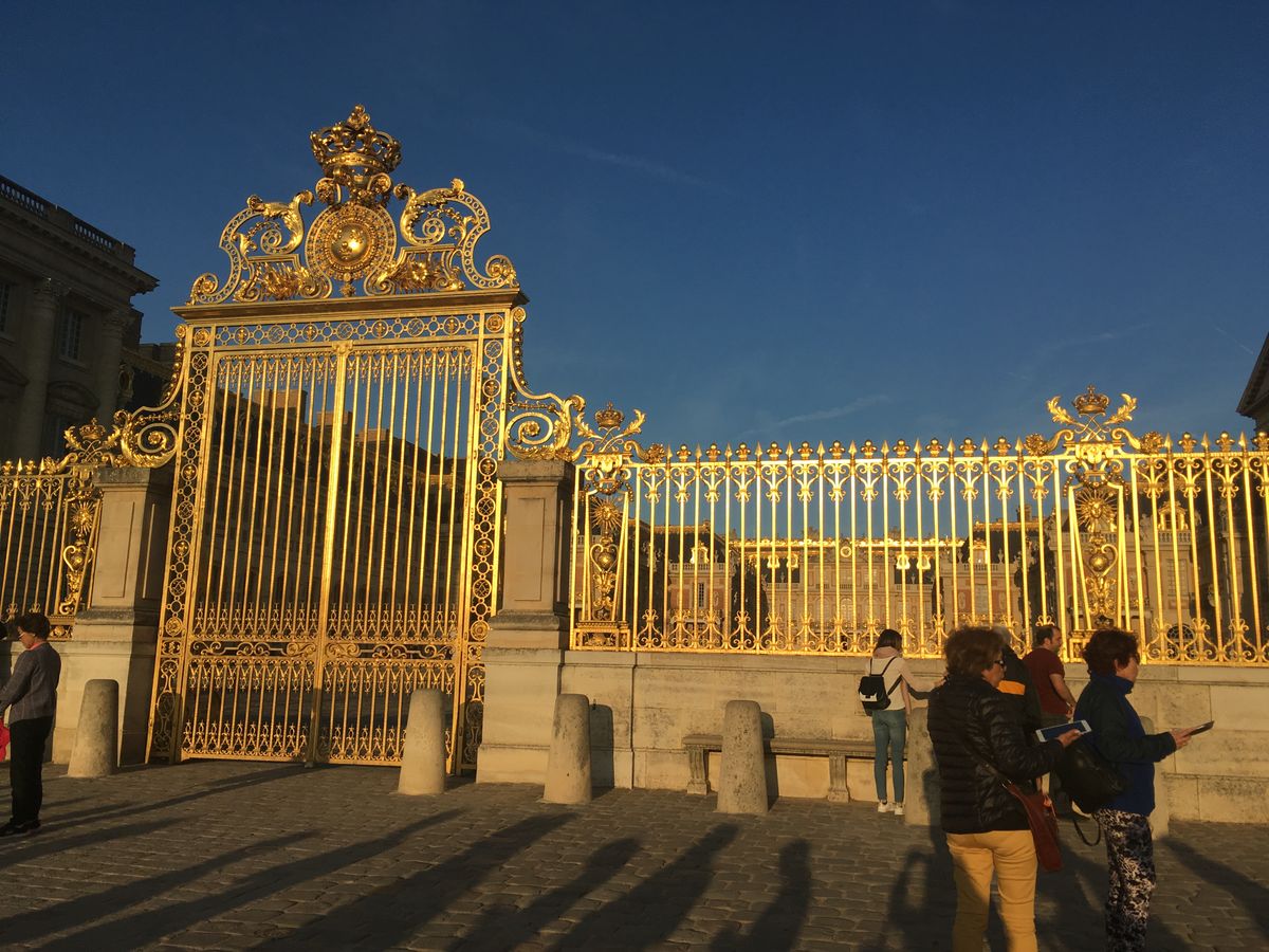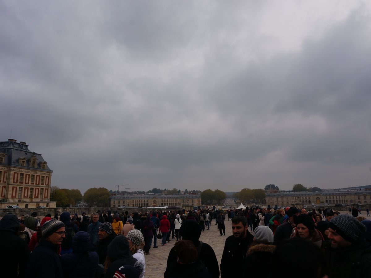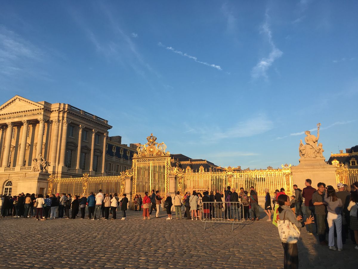 朝7時50分集合。日本の本州あたりの感覚ではもうすっかり明るい時間帯ですが、パリはまだようやく明るくなってきたな、という感じです。まだうす暗い中ホテルを出てきました。この日は日曜日で道路も空いていてスムーズに到着できました。すでに行列ができはじめ、気が付くと私たちの後にもあっという間にその数倍の行列ができました。良い時間帯に来れたなと思いました。宮殿内だけなら日曜の朝イチということもあり充分な時間があります。広大な庭園や周辺もじっくり回ってみようと思えば、事前にしっかり予習して計画的に行動する必要があるなと思いました(それは別料金だし)。