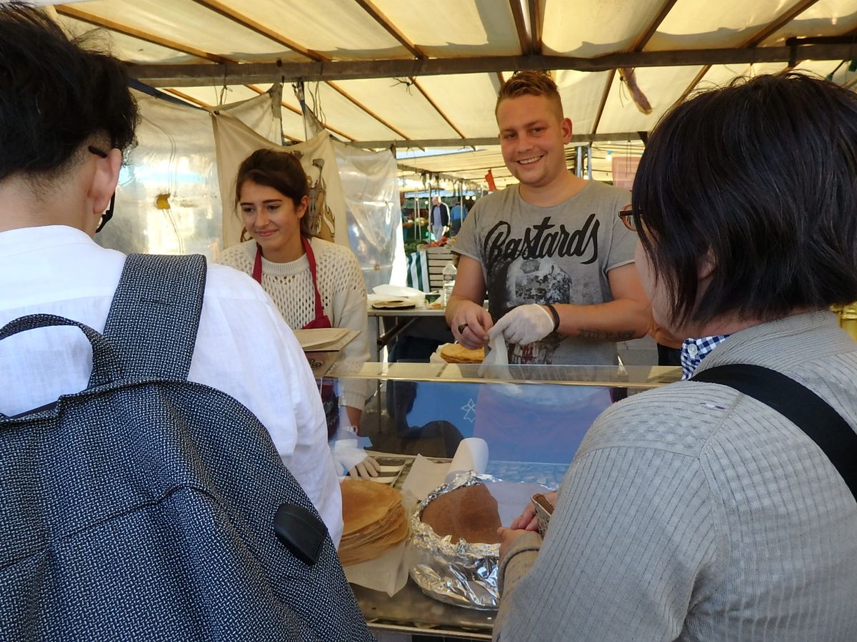そして、最高だと感じたのが朝市マルシェ。私が参加した日は、ベルサイユの街の中の週3回開催しているというマルシェで、ガイドさんオススメのフォアグラ屋さん、塩屋さん、果物屋さん、チーズ屋さんを回りました。塩屋さんの隣のガレットが安くてボリュームもあり大満足。ベルサイユ宮殿がメインだったのに、母も私も思いがけずマルシェを大満喫し、大満足のツアーでした。
