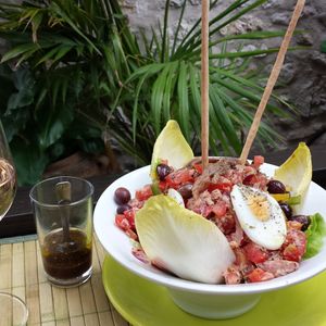 フラゴナールの香水工場もありましたが、前日にグラースで同じ店に行ってましたので、完全にスルーでよいと伝えると、観光時間充分あるので、何か食べてきてもよいとの事でしたので、まず頂上の植物園に入り、絶景をじっくり見てから、途中の道のりにあったデリという店で、ロゼワインとニース風サラダを食べました‼野菜が新鮮でとても美味しかったので、この店でオリーブオイルも購入しました。