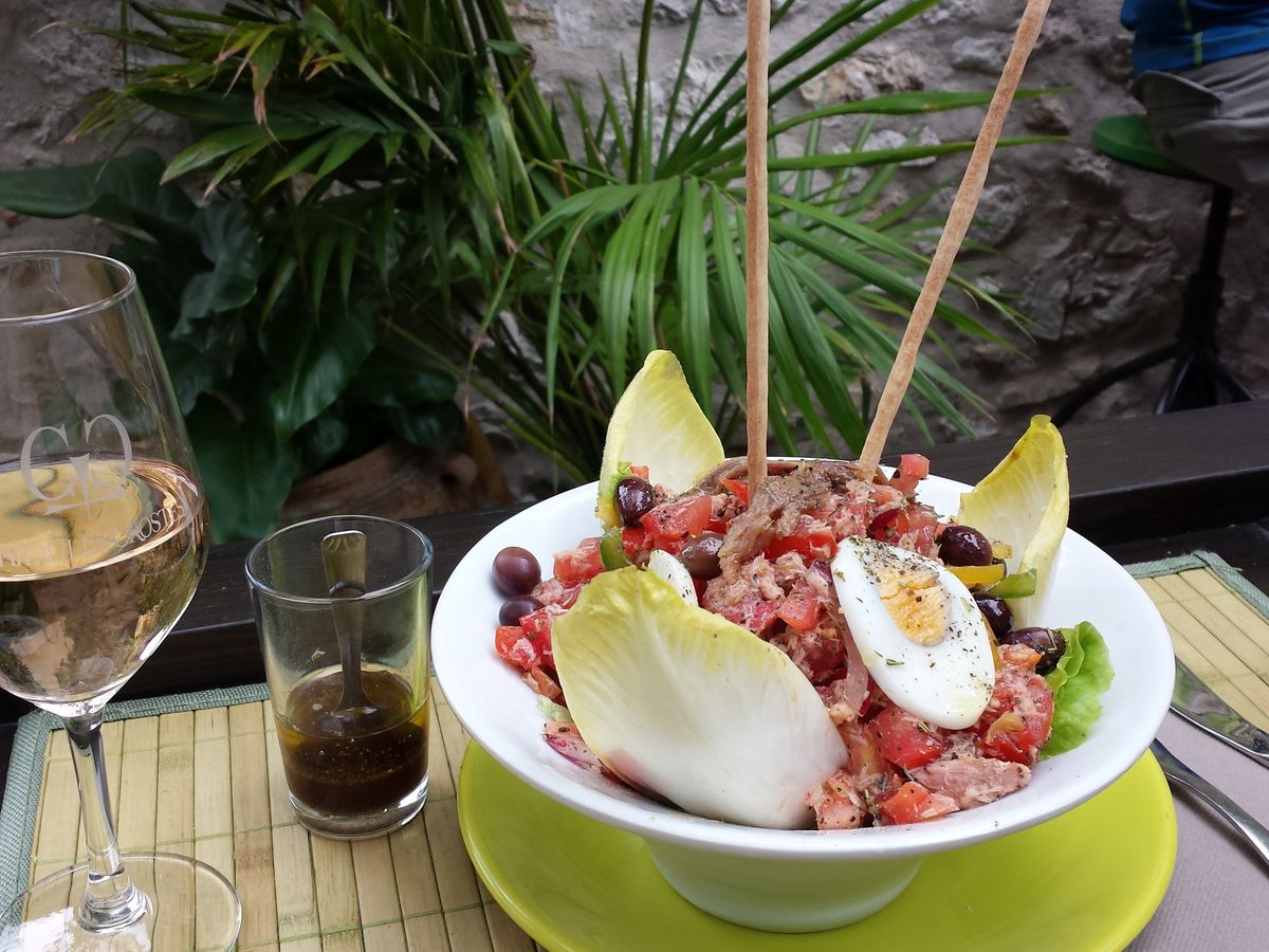 フラゴナールの香水工場もありましたが、前日にグラースで同じ店に行ってましたので、完全にスルーでよいと伝えると、観光時間充分あるので、何か食べてきてもよいとの事でしたので、まず頂上の植物園に入り、絶景をじっくり見てから、途中の道のりにあったデリという店で、ロゼワインとニース風サラダを食べました‼野菜が新鮮でとても美味しかったので、この店でオリーブオイルも購入しました。