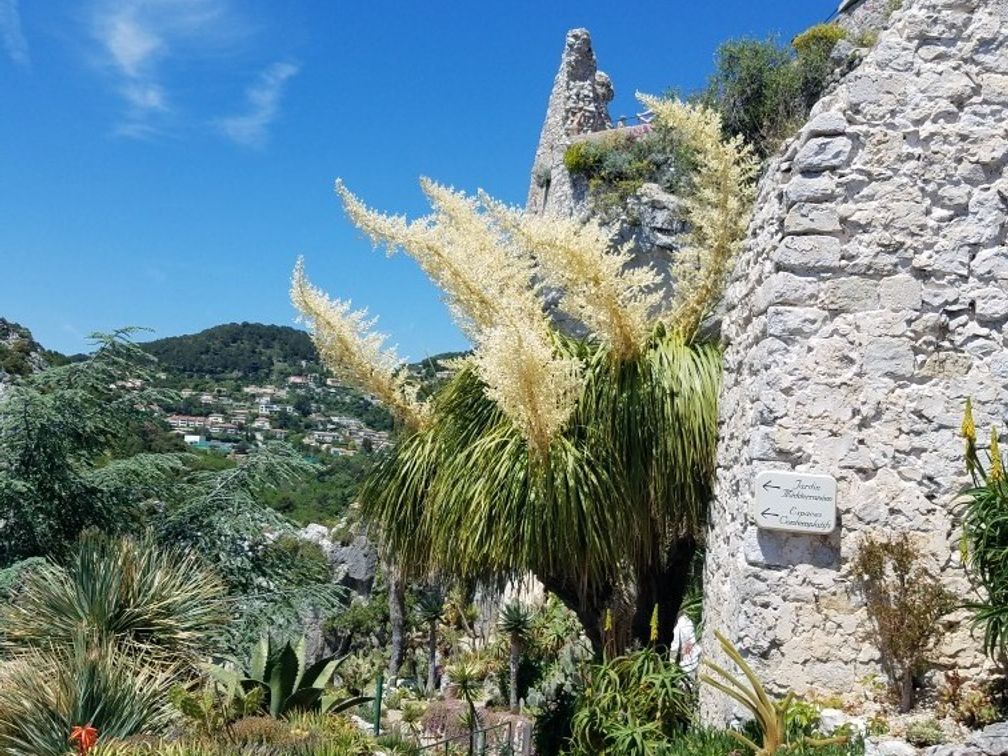 坂を登り切った頂上に、城跡に作られたエズ庭園。海抜429メートルからの、私有位を一望する眺めは壮観です。さまざまな植物とアートも展示されていました。