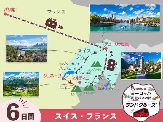 - 当コースは3日目のパリ→チューリッヒと6日目ブリーク駅→チューリッヒ中央駅の列車乗車区間を除き、全区間で日本語現地係員が同行しますので言葉の心配はなく安心してご参加いただけます。