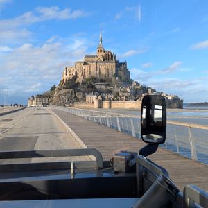 道中は静かで、少し眠気を感じながらも、次第に空が明るくなっていく様子に旅の高揚感が増していきました。突如現れる(大きいので)モンサンミッシェルは、青空を背景にくっきりと浮かび上がり、その姿は想像以上に壮観でした!