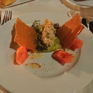 食事は前菜、メイン、デザートを3種類から選ぶのですがメニューは仏語と英語。でもボーイさんが簡単な日本語を話せます。私達の時は「肉、エビ、カニ」でした。食事の盛付、味、量 大満足でした。食事の間 ステージではバンド演奏がされて 楽しい雰囲気の中で食事ができます。