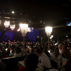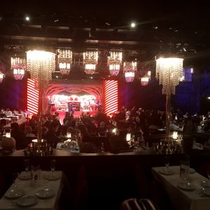 21時からの食事なしシャンパン付きコースに申込みました。少し早めに行ったほうが良いだろうと思い40分ほど前に到着、舞台からは一番遠いものの正面の4名席のステージ側に案内されました。一段内周もシャンパンのみ(団体客)、その内側から桟敷席までは食事付きのコースの席のようで、近くで見たい場合は食事付きのコースを選択する必要があるようです。