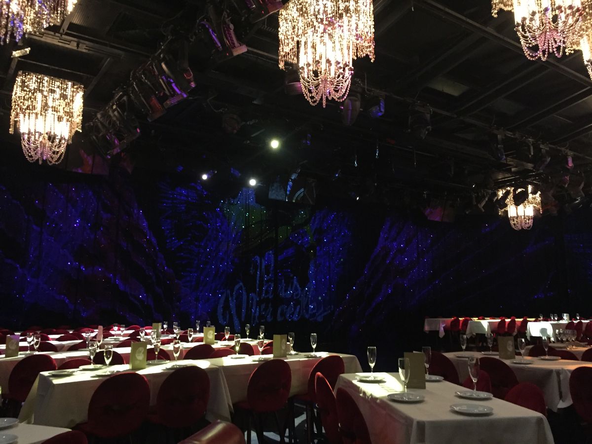 次はムーランと決めていたので申し込みました。20時45分ぐらいに到着しチケットを交換して貰い、入場口に行って少し待ちました。コートや荷物はクロークで預かって貰えますが一人2ユーロ必要になりますので、よほどの大荷物で無い限り預けなくても良いと思います。入場すると案内係が席まで誘導してくれ、スパークリングシャンパンかジュースか聞かれます。シャンパンはハーフボトル、ジュースは2本出てきます。私の席は3階ぐらいのちょうど真ん中辺りでした。舞台を見渡すことが出来たので席は悪くないと思いましたが、とにかく狭いです。小さい細長いテーブルに6人座りますので、大柄な外国人が一緒だと途中席を立つことは難しいと思いました。ショーはアクロバティックなものや宝塚のショーのような感じのもの、動物が出てくる場面もありなかなか面白かったです。ファーストショーだったので終わりも11時前で周辺は人が多くあまり不安はなかったです。宿泊先も15分ほどの場所だったので歩いて帰りました。