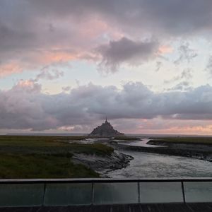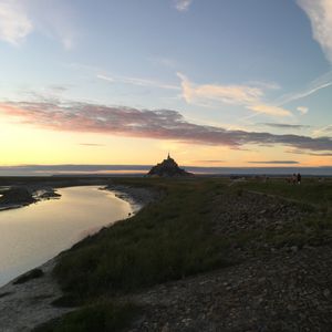 1830 下に降りて城壁の外(桟橋の手前辺り)で、モンサンミッシェルが海に囲まれるのを見ているうちに夕焼けとなりました