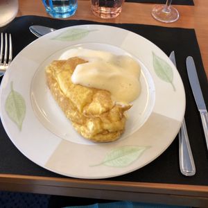 オムレツ付きのツアー。他のテーブルで配られている大きく膨らんだフワフワのオムレツを見て、ワクワクと期待していました。切り分けられるときには中からトロッとクリームのようなオムレツが出てきていました。おいしそうと娘と期待を膨らませておりました。ところが、我々のテーブルに運ばれてきた大きなオムレツは火が通り過ぎてペッシャとしぼんだものでした。固い卵焼き。他の人のオムレツも目にしていたので、その違いは明らかであり、我々のテーブルは落胆のため息で一杯でした。我々から添乗員は離れて食事しており、クレームを付けに立って言いに行くのも面倒になり、彼女には何も言いませんでした。しかし、腹立たしい気分で満たされました。プロの添乗員であれば、客にサーブされた料理全体の状況も確認すべきです。アマチュア添乗員だなと感じました。
