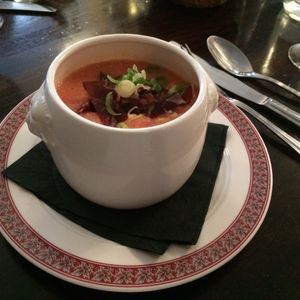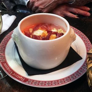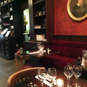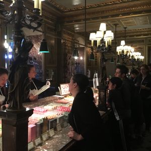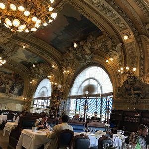 前日にオペラ座の見学をした時にお店がみえました。レストランの中は、なかなか豪華です。海鮮類のプレートを食べている人が多かったです。オニオングラタンスープ、ステーキ、デザートにオペラを食べましたが、どれもボリュームがあります。トイレは2階で、螺旋階段を上がっていきますが、とても落ち着いて素敵です。