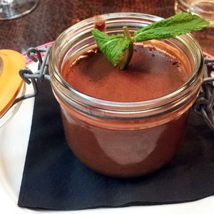 デザートはブラックチョコレートと塩バターキャラメルのムース。とても大きな容器に入ってきてまたビックリ!!濃厚で美味しかったけど、一人で食べるには大変だった。