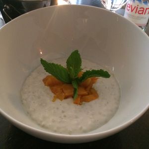 選んだメニューの「セビリア風トマトの冷たいポタージュ」はピリッとした辛みがきき、「ゴマをまぶしたマグロの鉄板グリル」もハーブの風味で食べやすく、「タピオカのココナツミルクソース」は日本でも食べたことがありましたが、どれもおいしくいただきました。安いツアーの食事と比較すると段違いです。
