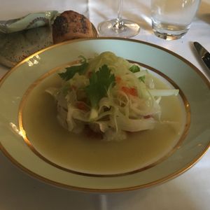 私はメインの蒸し鶏のカリカリ仕上げをとても期待していたのに、千切り野菜を炒めた上にナッツをまぶした蒸し鶏胸肉が出て来ました。野菜の炒め物はパッとしない中華風?の味で、鶏胸肉は味も旨味もなにもなく、パサパサしていました。(カリカリは一体なんのこと?もしかしてなんの工夫もだあれていないナッツのこと?)
