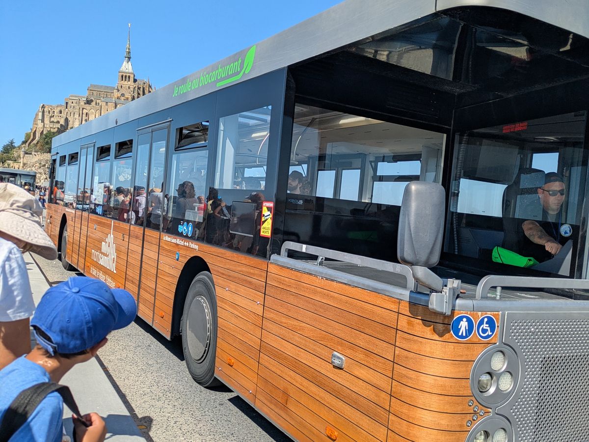 以前は島の直ぐ下までバスで行けた。今は新しい堤防が整備され、対岸からシャトルバスに乗るか歩くかの選択。以前のように個人で来るにはかなり大変そうに感じたので今回はツアーに参加した。団体駐車場までバスで行け、すぐ前にはシャトルバス乗り場、土産物屋もレストランもあるので楽だった。食事付きを選んだが、参加者は皆さん島で食べると思っていたが、対岸のレストランでオムレツや魚料理、デザートが出てきた。飲み物は別料金でその場で会計。車内で地図とチケットをもらい対岸からは自由行動。並ばずに見学でき、島内で買い物や飲食もできたので時間としては十分見学できた。ガイドさんは集合時間に間に合うよう詳しく教えてくれたので、遅刻する人も無くスムーズにParisに戻れた。途中のトイレ休憩は時間があまりなく慌ただしかったが、止まったサービスエリアはどちらもパン屋やスーパー、行きはケンタッキー、帰りはマクドナルドとあり、便利ではあった。