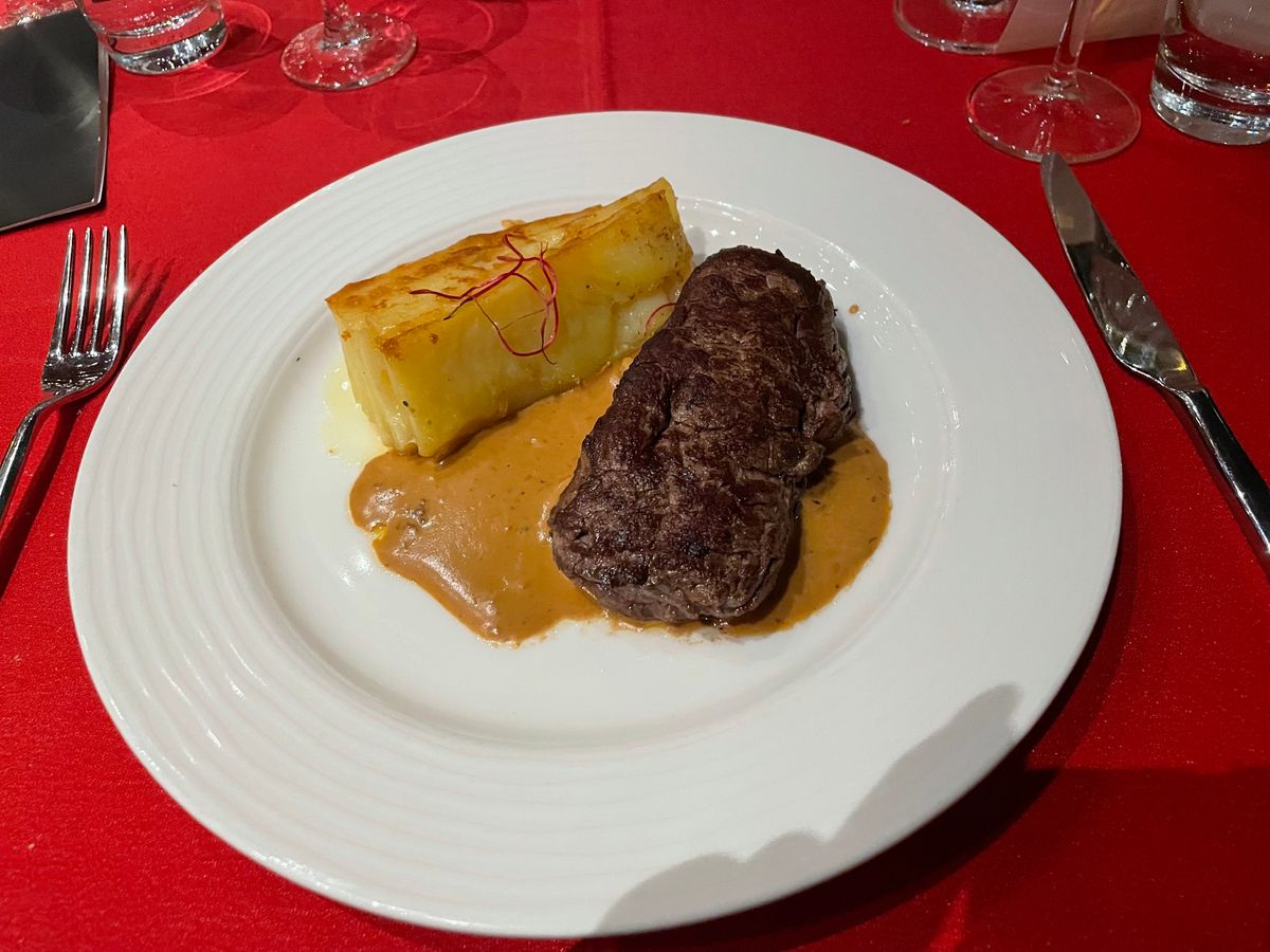 食前酒のシャンパンから始まり、白ワイン、赤ワインとかなりたくさんアルコールがサービスされる。料金はすべて含まれているので、船内で支払いはない。飲みきれない場合は、お願いすればボトルごと持ち帰れる。前菜、メイン、デザートの3コースは、それぞれ選ぶが、日本語のメニューもあった。