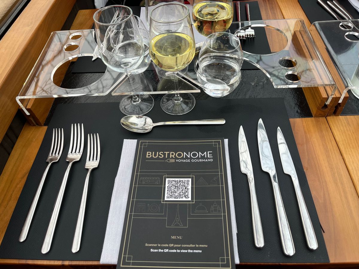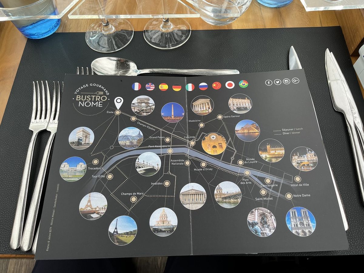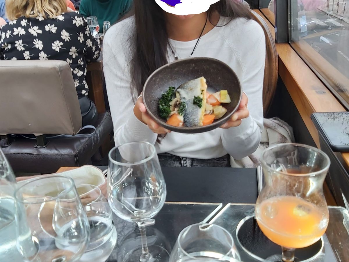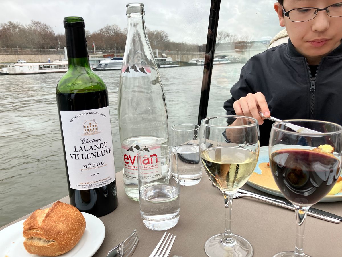 予約は中央席だったけど、現地窓口で窓側席を勧められて、一人15€とちょっと高くついたけど、夜景がよく見えて素晴らしい。特にエッフェル塔がライトアップされて素晴らかった。乗客はほとんどマスクなし。私たちだけでした。料理は私たちには充分でしたが、若い人には少し物足りないかも。グラスワインは赤、ロゼ、白の3種類用意されていて、8€/杯。