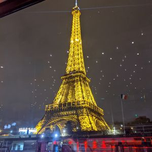 9人で参加したので船の真ん中ら辺に席が準備されていました。そのため外の景色を席から撮ると他のお客さんが写ってしまって悲しかったです。とても寒かったので外には出ていませんが船内からもライトアップしたエッフェル塔も見え綺麗でした。