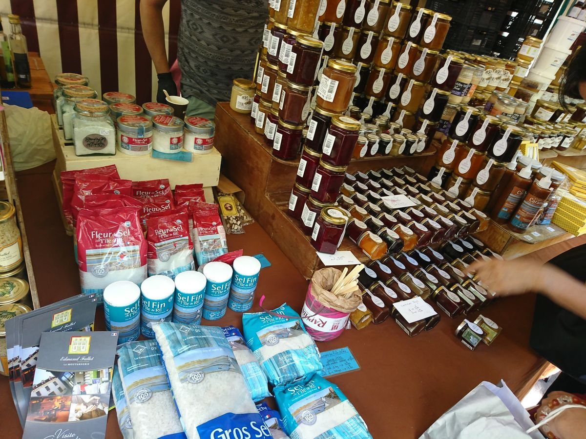 お隣のチーズ屋さんでは熟成年数の異なるものをいくつか試食。 次に近くのマルシェへ。その中のジャム屋の店員さんとAkikoさんが仲良しの様で、色々なジャムを試食させてもらいました。小瓶でも売っていたので思わず自分土産用に5点購入。