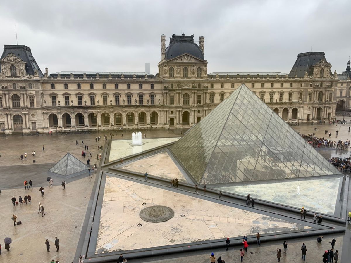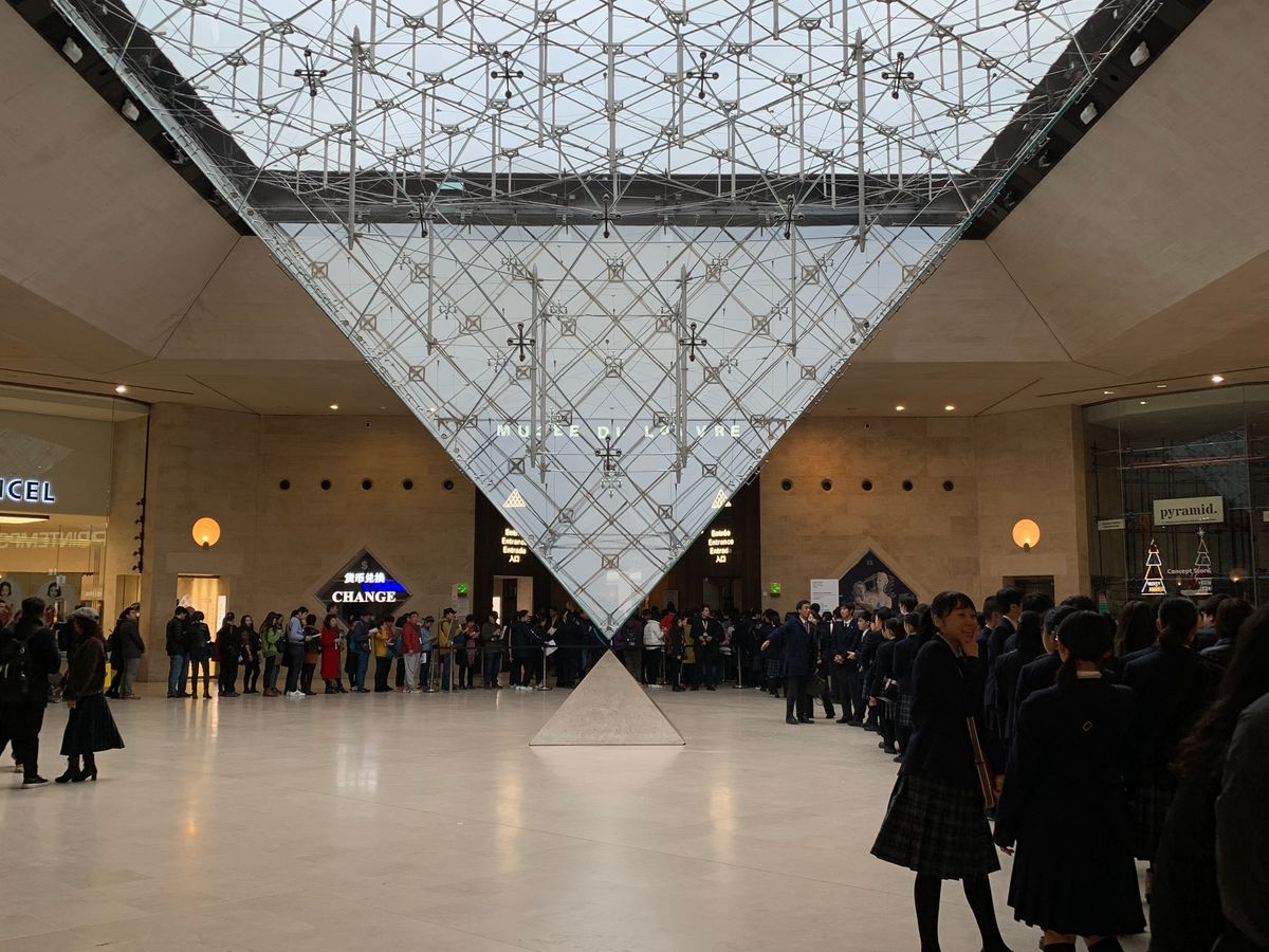 あまりにも広すぎて個人で効率よく周るのは難しく、最近はミュージアムパスですら入場が難しいとの事でしたので参加しました。マイバス社集合、徒歩でルーブル美術館に向かいます。超有名なピラミッドを外から撮影した後、地下へ。グループ専用入り口に並びましたが、長蛇の列で且つなかなか動かない。