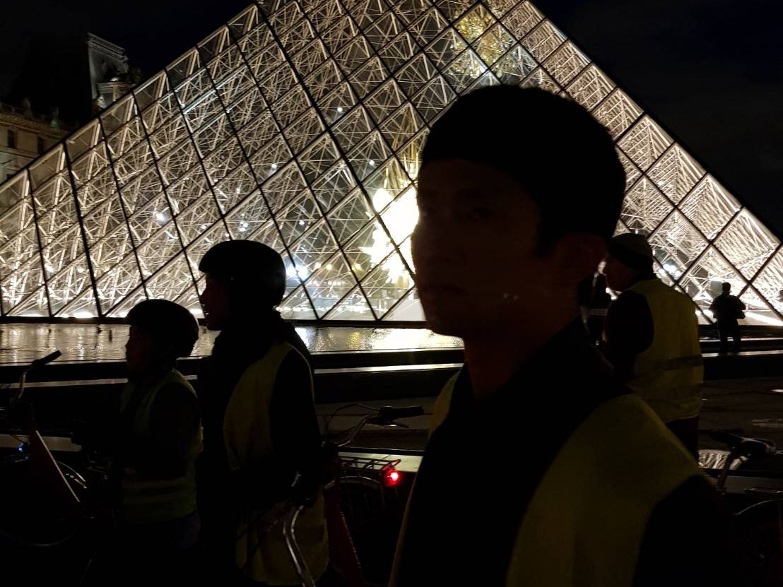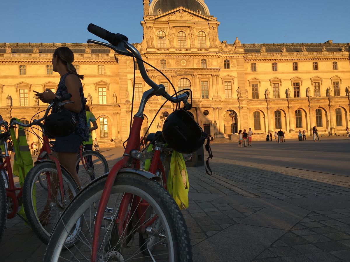 陽が傾いた7時くらいに出発し、パリの街中を自転車で走りました。途中、セーヌ河畔も走ったり、ルーブル美術館の中庭(?)を走ったり、とても爽快です。電動自転車ではありませんが、あまり疲れるような坂道はありません。