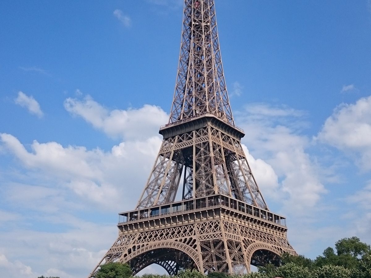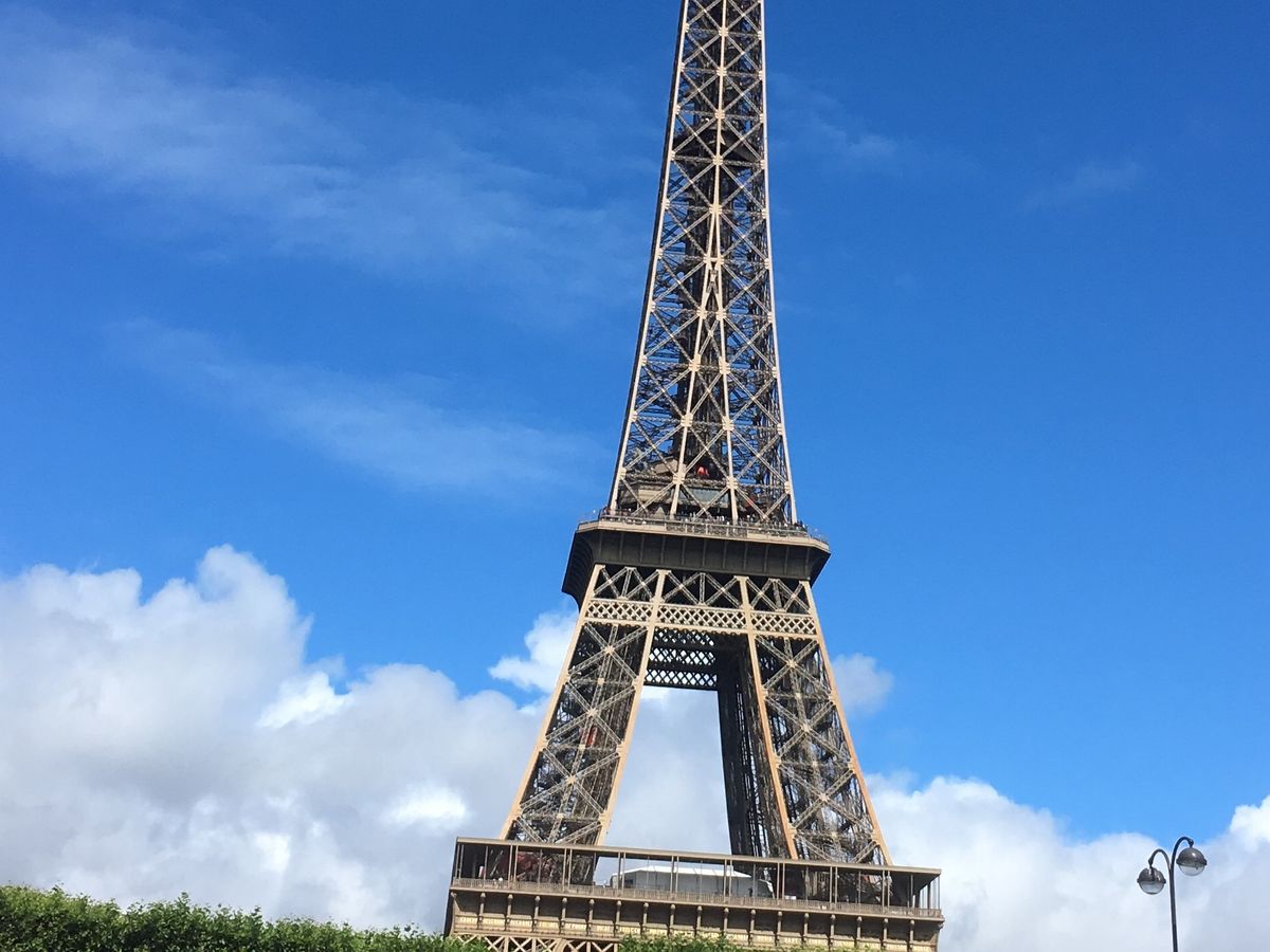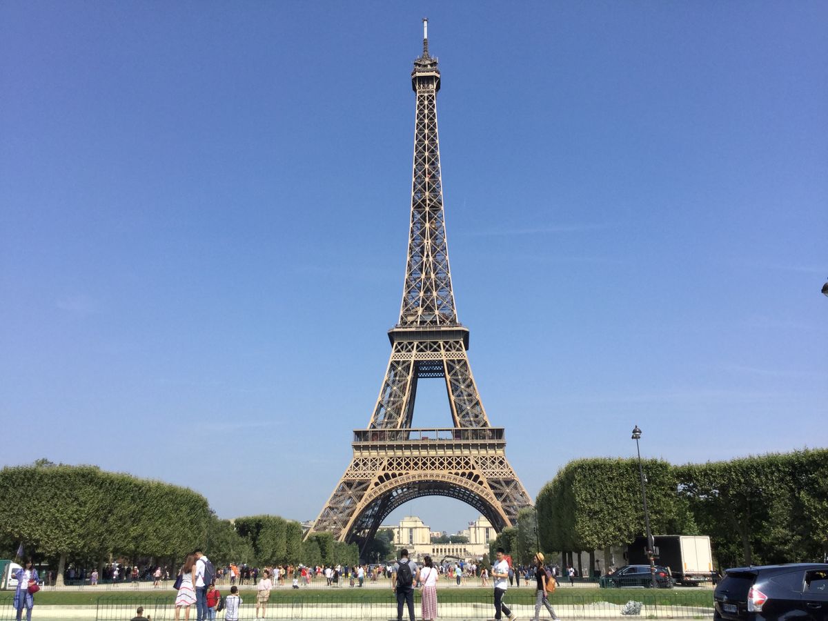 まずはエッフェル塔の南側で夕暮れにそびえ立つ美しい塔を観賞。