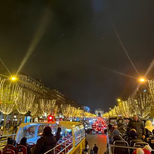 クリスマスの巴里の人気観光スポットを見晴らし抜群の二階席から楽ちんに座ったまま全て巡ってくれる快適バスでした。途中小雨が降りましたがバスによっては二階席前方部分に圧迫感の無い屋根がついており問題なく楽しめました。途中乗り降りも自由なのでお気に入りの場所で下車しお洒落な巴里の風景をバックに写真も取り放題です。昼に一周してルートを把握し光の溢れるシャンゼリゼを夢見て17時過ぎの最終バスに寒さ対策を万全にして再び見晴らしの良い二階席に乗り込みました。同乗の多国籍の観光客達もテンションMAX笑顔MAXでした。特にエッフェル塔のシャンパンフラッシュが1時間に1回5分間✨煌めきますのでお見逃しなく!息を呑む美しさですよ❤️
