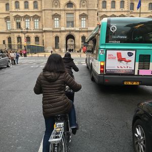車道を実際に走るのは結構爽快感があって、スリルがあり、実際パリには自転車を借りることができるなんか公共の貸し自転車があったと思いますが、地理に詳しくなく、道路の状態も知らないまま乗るのはまず不可能かと思います。